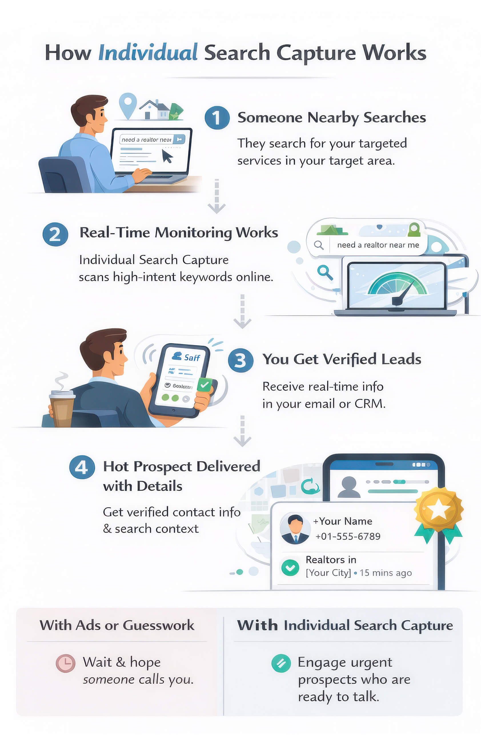Individual Search Capture reveals up to 40% of high-intent individual searches, allowing you to engage people at the exact moment they are looking for what you offer.