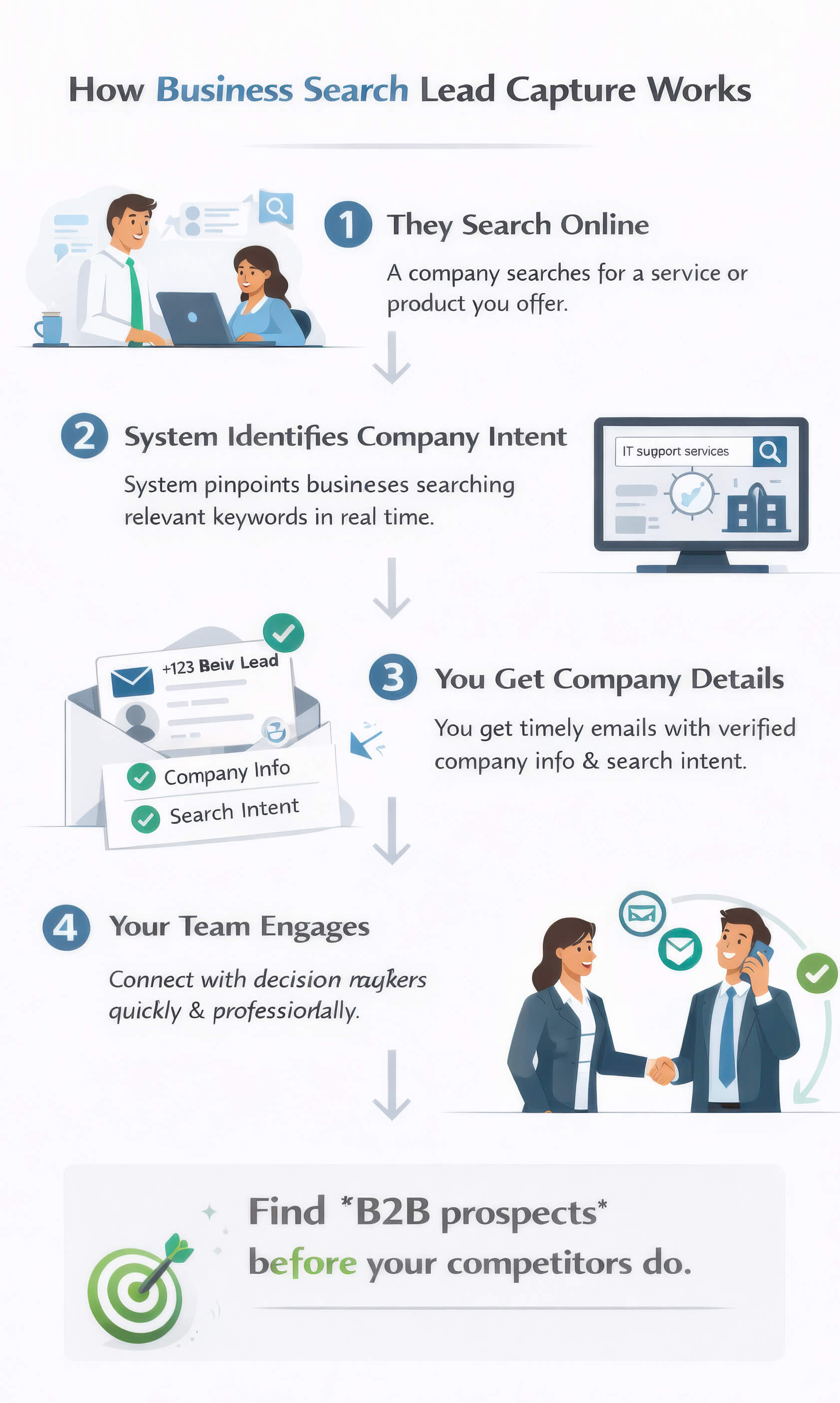 Company Search Capture applies the same technology to business and organization searches, helping identify up to 40% of companies showing active intent so you can reach decision makers before competitors do.